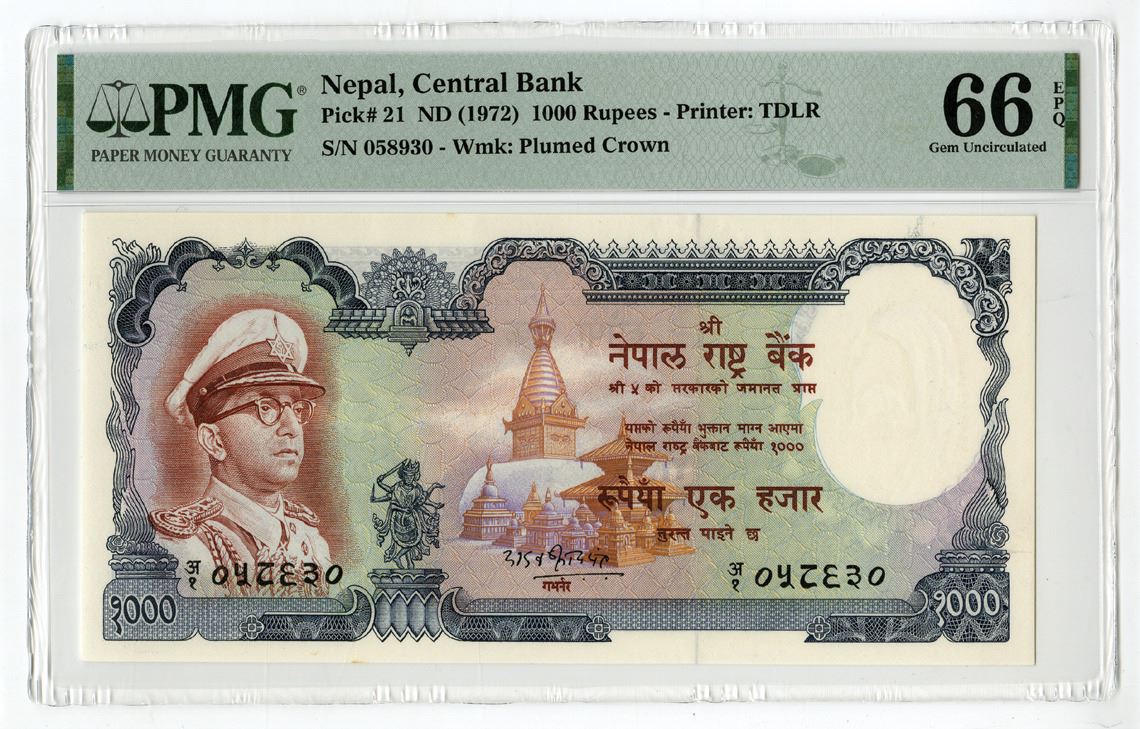 Nepal, ND (1972). 1000 Rupees, P-21, Issued Banknote, Blue on m/c underprint with King Mahendra Vira Vikrama at left, Back is m/c with mountains at center, S/N A 058930, PMG graded Gem Uncirculated 66 EPQ, TDLR.