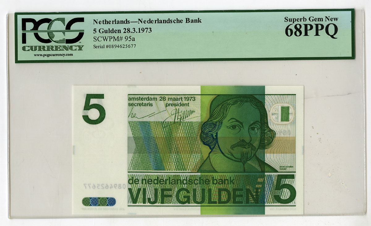 Netherlands, 1973.. 5 Gulden, P-95a, Issued Banknote, Dark green on green and m/c underprint with portrait of Joost van den Vondel at right, Back is green and m/c graphic design, S/N 0894625677, PCGS graded Superb Gem New 68PPQ.