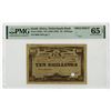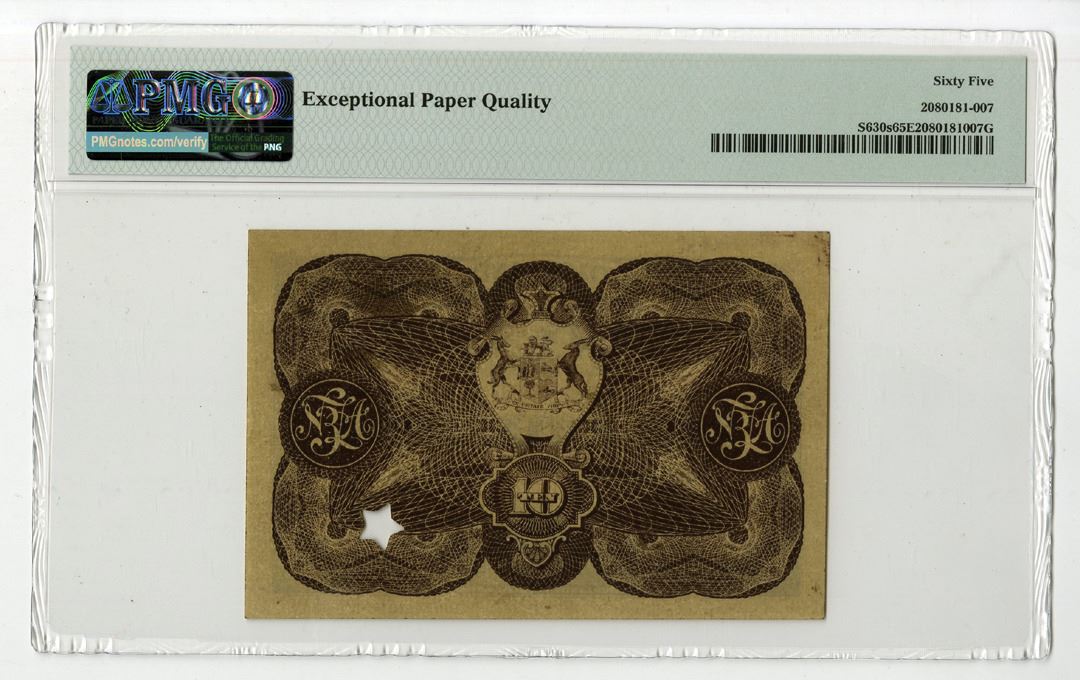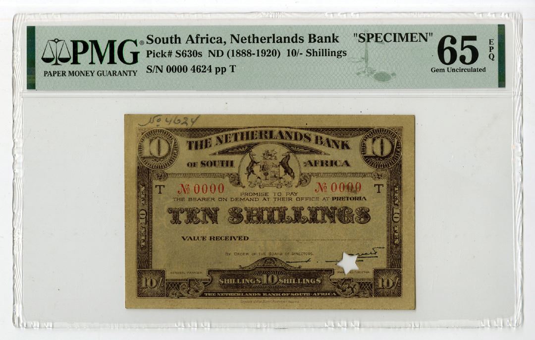 South Africa, ND (1888-1920). 10/- Shillings, P-S630s, Specimen Banknote. Dark brown printing on light beige color paper with arms at center, back dark brown printing with arms at center with ornate cycloid design. Star shaped POC, red S/N 0000 with pencil notation in top left corner N0. 4624, pp T. PMG graded Gem Uncirculated 65 EPQ. This is the highest graded note out of 2 graded in the PMG census.