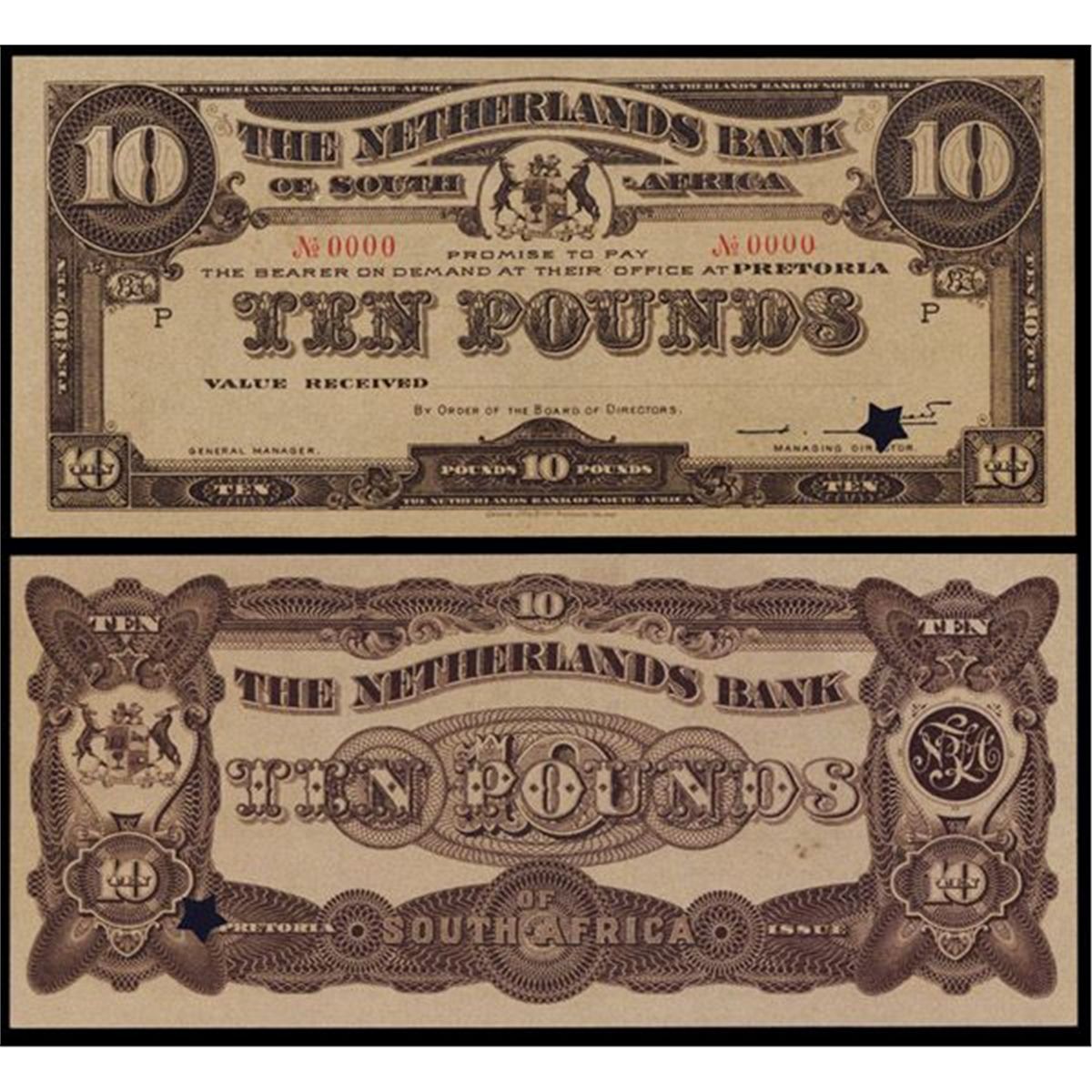 Pretoria, South Africa. ND (ca.1920). 10 Pounds, Series P, P-S636 specimen banknote. Dark brown on light tan paper with arms on top middle, Text in English, back is dark brown on light tan paper with arms on left and bank logo on right. 3 Star cancels in signature block on right. Red S/N 0000. Unpriced in SCWPM. J.H.Bussy, Amsterdam, Netherland, Printer. A trophy note in any collection.