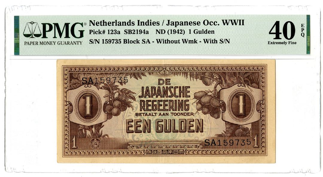 Netherlands Indies/Japanese Occupation WWII. ND (1942). 1 Gulden, P-123a SB2194a, Issued banknote, Brown, S/N 159735 Block SA - Without Watermark - With S/N, PMG graded Extremely Fine 40 EPQ.