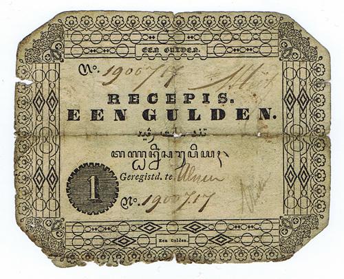 Netherlands Indies, 1846, 1 Gulden, P-39a, Issued banknote, Black with no underprint, ornate border, Handwritten signature, serial number and date, S/N 19.007.17, Musical notation type of border, Stamp hinge reinforced splitting and fragile folds on back, rare note in any form.