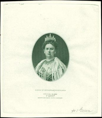 1919-20. P-Unlisted. Proof. Proof vignettes of portrait of Queen Wilhemina. 4 different colors. Portraits used on P-100 and P-101. Rare proofs. ABN. Uncirculated.