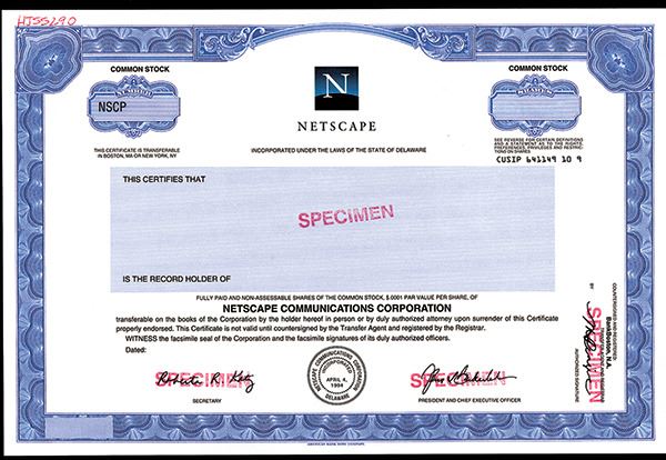 Delaware, ND, Odd Shares, Black print on blue border and underprint, Netscape logo top center, Red SPECIMEN overprint, VF-XF condition, ABNC. Netscape was the first company to attempt to capitalize on the (then) nascent World Wide Web. It was originally founded under the name, Mosaic Communications Corporation, on April 4, 1994. Rare early internet certificate.
