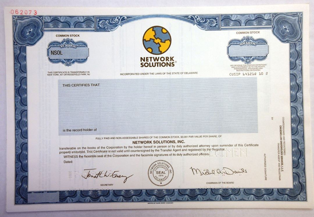 Network Solutions, Inc., 1999 Odd Shrs Specimen Stock Certificate, XF ABN Blue. Network Solutions, LLC is an American-based technology company founded in 1979.