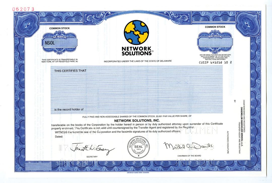 Delaware, 1999. Odd Shares Specimen Stock Certificate, Black text with blue border and undertint, Company logo at top center. Specimen POCs, VF-XF condition, ABNC. Network Solutions is an American-based technology company and a subsidiary of Web.com, the 4th largest .com domain name registrar with over 6.7 million registrations as of August 2018. In addition to being a domain name registrar, Network Solutions provides web services such as web hosting, website design and online marketing, including search engine optimization and pay per click management.