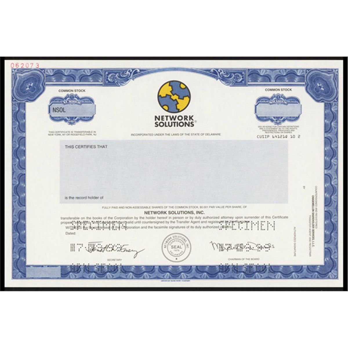 1999, Specimen, Odd Shares, Network Solutions logo in blue and yellow, Pin punch cancels, XF. Famous Domain name registrar technology company.