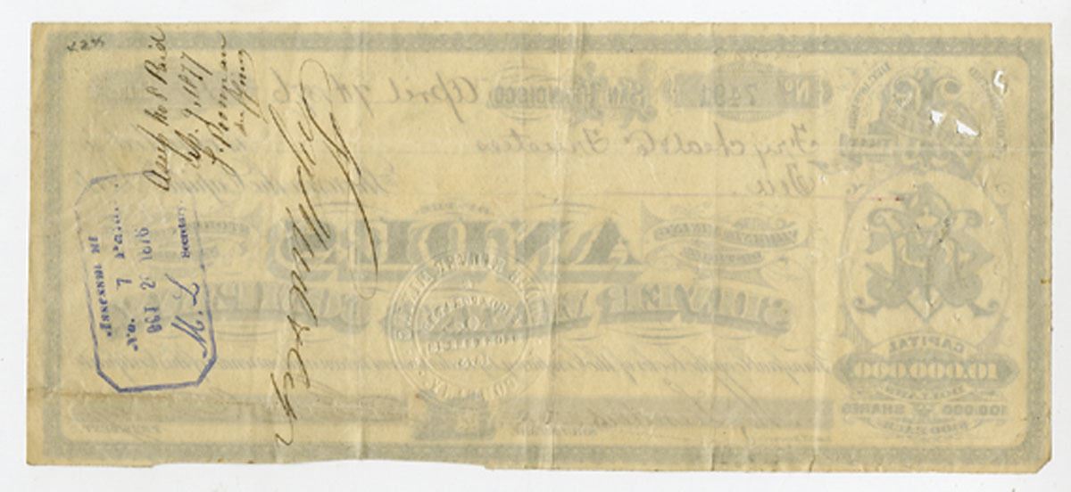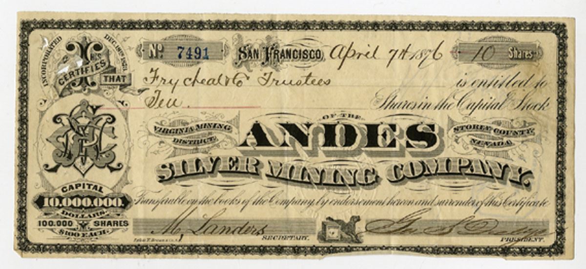 Virginia Mining District, Storey County, Nevada. (Offices in San Francisco, CA.), 1876, 10 Shares, I/U stock certificate, Ornate title with logo at left, S/N 7491, VF-XF condition with small pin holes from being attached to document. Signed by Geo. S. Dodge as president. Dodge received a historic silver ingot. ”The Ingot Recipient, George Sullivan Dodge was a decorated Civil War veteran, who was brought to the West Coast about 1871 to manage the monstrous new silver company in Eureka, the Eureka Consolidated. The mine was so rich that it rivaled the best of the Comstock, ultimately producing over $20 million from 1873 to 1906 alone. Dodge’s office was in San Francisco, right in the center of the Montgomery Street business section (Bank of California, etc.) where most of the financial ends of the Comstock mining barons took place. Dodge appears to have been appointed the first president of the Company, with the attendant job of getting the mine into profitable and large scale production. He was in charge of hiring the best mining men and putting together a mining crew to rival the best on the Comstock. George Sullivan Dodge (August 3, 1838 - August 24, 1881) was a Union Army officer during the American Civil War, a United States consul to Bremen, Germany and a merchant. Dodge, the son of William P. and Nancy B. Dodge (1806-1853), was born on August 4, 1838, in Irasburg, Orleans County, Vermont, Dodge became a prominent merchant. With the outbreak of hostilities in the American Civil War, Dodge entered a volunteer regiment for the Union Army and was appointed colonel in the army's Quartermaster Department. During the war's later years, he served as Chief Quartermaster of the Army of the James under Major General Benjamin F. Butler and later under Major General Edward O.C. Ord. On January 26, 1865, President Abraham Lincoln nominated Dodge for appointment to the grade of brevet brigadier general to rank from January 15, 1865 for his last-minute resupply of beleaguered Union forces at the Second Battle of Fort Fisher (January 13–15, 1865) and the United States Senate confirmed the appointment on February 14, 1865. He later participated in the Battle of Wilmington (February 11–22, 1865). After the war, Dodge served as the United States Consul in Bremen, Germany (1866-1869)