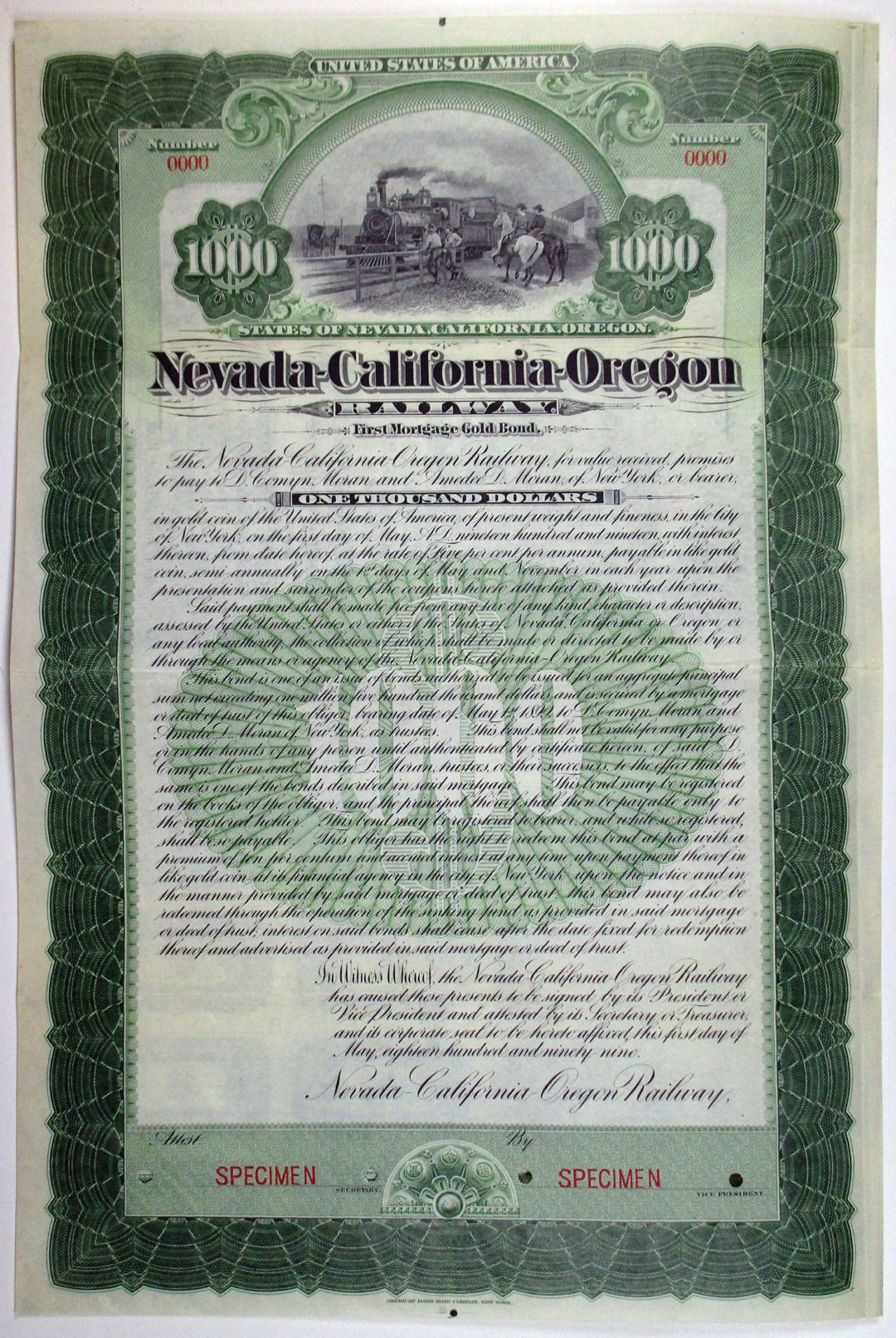 NV, CA & OR, 1899. $1000 Specimen 5% First Mortgage Gold Bond, Black text with green border and undertint, Train passing by men and men on horseback at top center. Red specimen overprints, 0000 serial numbers, and POCs. VF condition, ABNC. Only found as a specimen with no issued examples known. Rare railroad bond with only 4 examples found in the ABN Archives in 2002.