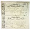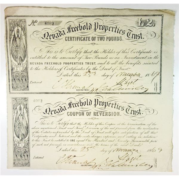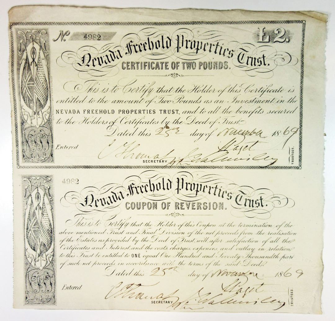 England, 1869. 2 pieces, uncut: 2 Pounds I/U Investment Certificate, S/N 4982, Black text with black border, United Kingdom and American flags at left with company seal at bottom, Embossed company seal at right; Lot also includes an attached Coupon of Reversion Certificate, same S/N with matching signatures, same design at left and embossed seal at right. Fine condition with slight signs of wear along margins, still in good condition for its age. Rare and early Nevada Mining Bond.