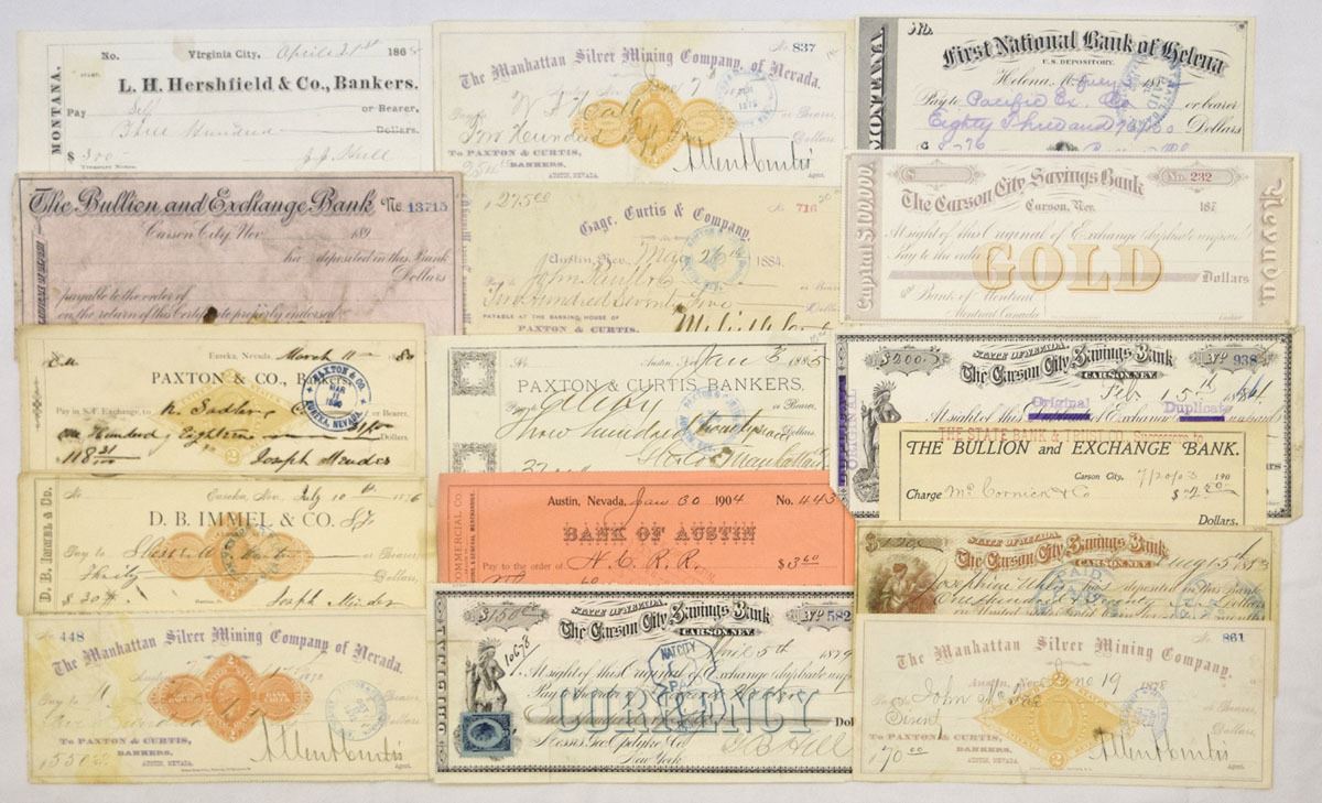 Nevada & Montana Territory, 1868-1904. Lot of 16 Issued bank and mining company checks representing early Nevada silver mining and frontier banking history. Includes examples from The Manhattan Silver Mining Co. of Nevada; Paxton & Curtis, Bankers, Austin; D.B. Immel & Co.; L.H. Hershfield & Co., Bankers, Virginia City; The Bullion and Exchange Bank, Carson City; Carson City Savings Bank; and Bank of Austin, among others. Several pieces are payable in Gold and feature ornate engraved mining and allegorical vignettes, detailed typography, and multiple imprinted orange revenue stamps. Condition ranges from Fine to Very Fine overall, with folds, punch cancellations, edge wear, and normal banking markings. (16). Sold “AS IS” no returns accepted.