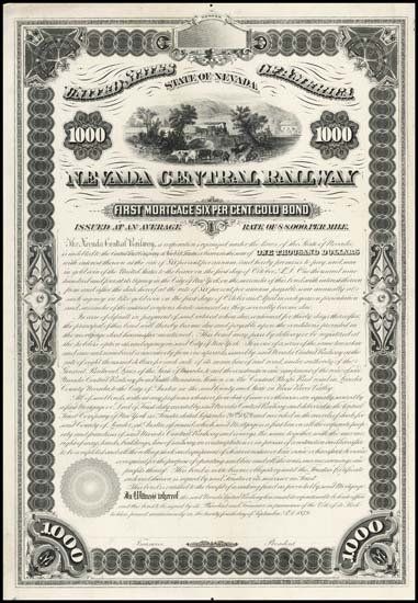 Proof bond face with coupons and bond back. 1879. $1000. 1st Mortgage 6% Gold Bond. Black Title, vignette, border and no undertint. Printed on india paper with no mounting card. Well known vignette of "The Crossing" on top with train going over bridge with cattle drinking from stream. This vignette is well known for being on the First Issue Montgomery Confederate banknotes. Choice XF condition with minor bends and folds from archival storage.Dated Nov and Oct. 1879 on both face and back. Coupons attached. ABNC. Unique, very attractive and early Nevada railroad bond.