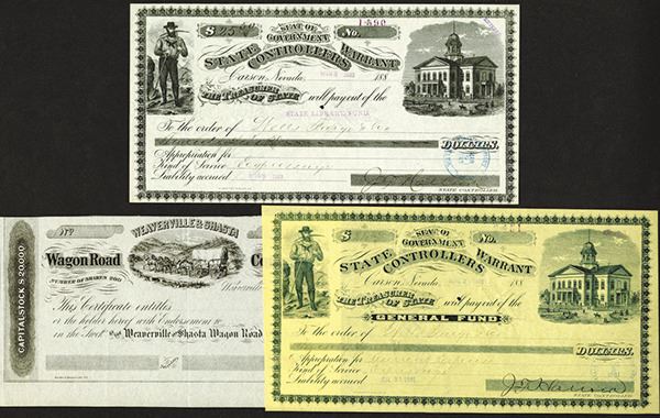 Nevada. State Controllers Warrants made our to Wells Fargo & Co. (2 different); California. Weaverville & Shasta Wagon Road Co. 18xx. Remainder Stock Certificate. Great wagon vignette. 3 pieces. VF+