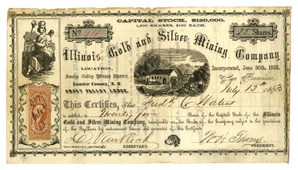 Lander County, Nevada Territory (Offices in San Francisco, CA), July 15, 1863, Illinois Gold and Silver Mining Company, 25 Shares at $100 each, I/U stock certificate, S/N 14 issued for operations in the Smoky Valley Mining District, Smokey Valley Ledge, Lander County, Nevada Territory, central vignette of a mining settlement with surrounding hills, flanked by seated allegorical Liberty at left, 25¢ U.S. revenue stamp affixed at left, signed by the company president and secretary, engraved by Waters Brothers & Co., San Francisco, Choice Fine to VF condition or better.