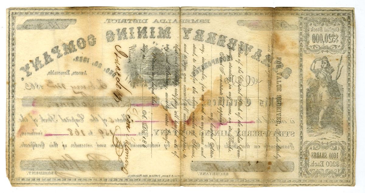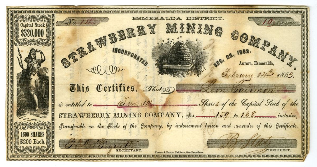 Aurora, Nevada Territory, 1862. 10 Shares Capital Stock I/U Stock Certificate, Black printing with bee hive at top center under company title and Native woman with bow and arrow at left, S/N 14, Fine to VF condition with light stains at center. Towne & Bacon, Printers.