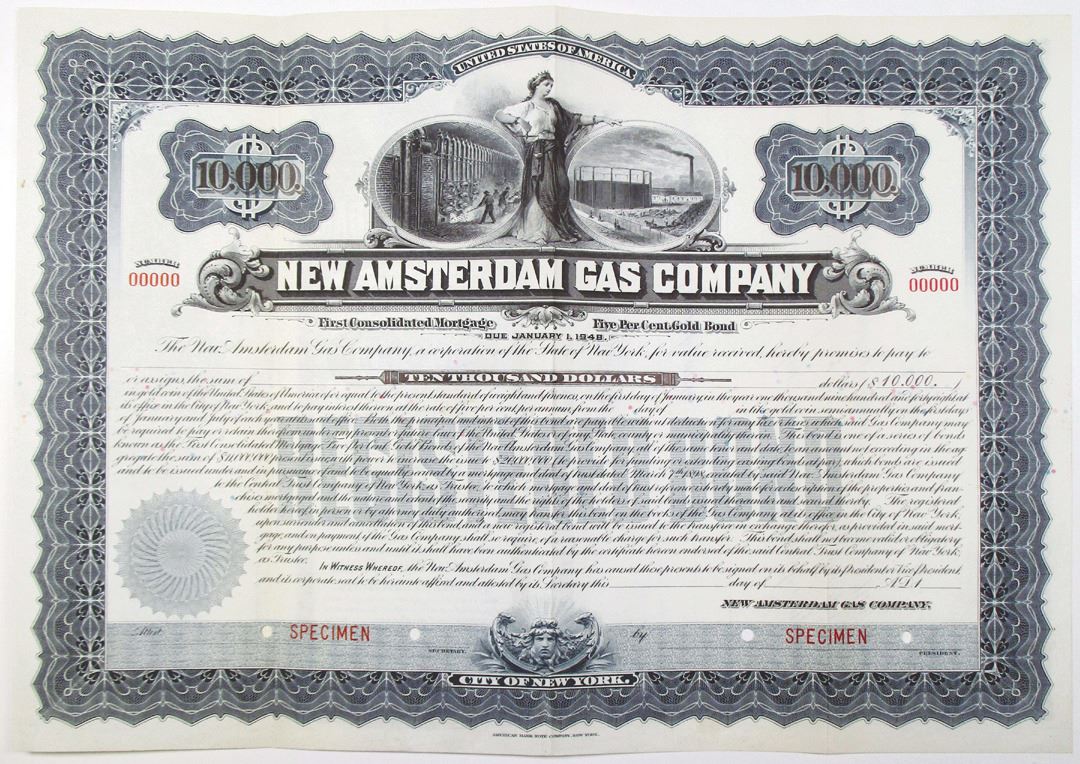 New York, ND (1898). $10,000 Specimen 5% Registered First Consolidated Mortgage Gold Bond, Black text with gray border and underprint. Allegorical woman at top flanked by scenes in oval frames. Red specimen overprints, 00000 serial numbers, and POCs. VF condition, ABNC.