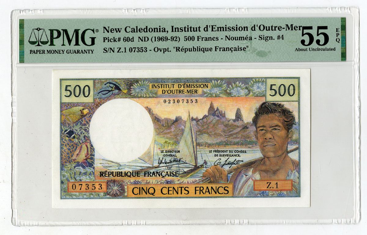 New Caledonia, ND (1969-92). 500 Francs , P-60d, Issued Banknote, Blue with brown and m/c printing, Dugout canoe and sail at center with fisherman at right and overprint of Republique Francaise at lower left, S/N Z.1 07353, PMG graded About Uncirculated 55 EPQ.