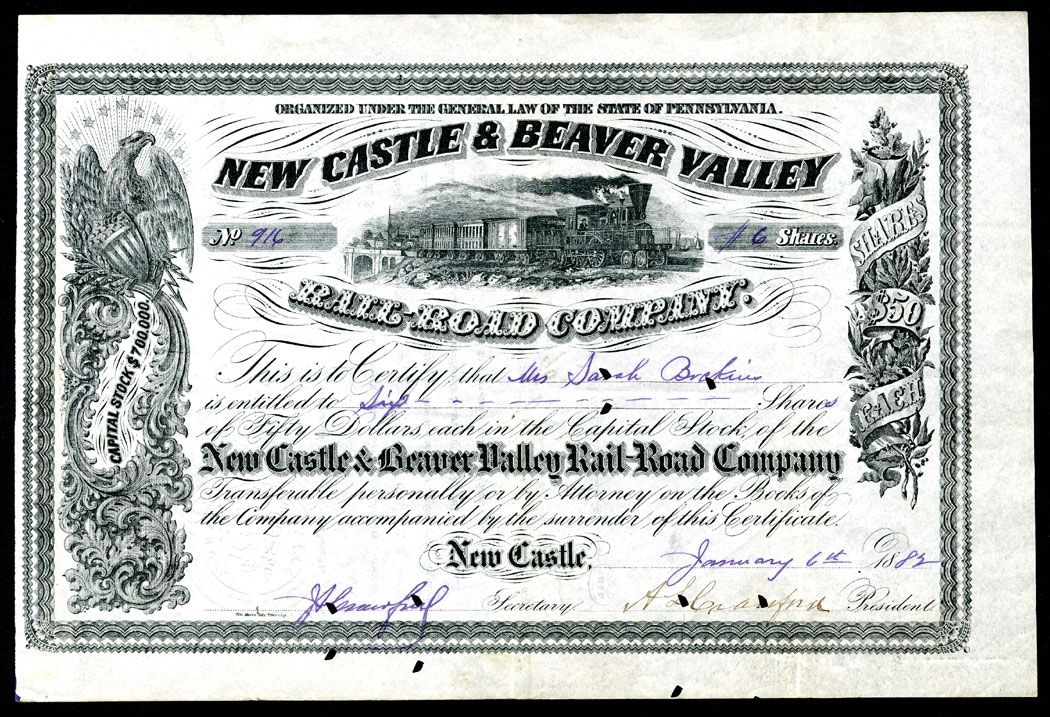 Pennsylvania, 1882, New Castle & Beaver Valley Railroad Co. 6 Shares, $50 each, Stock Certificate, VF Condition.