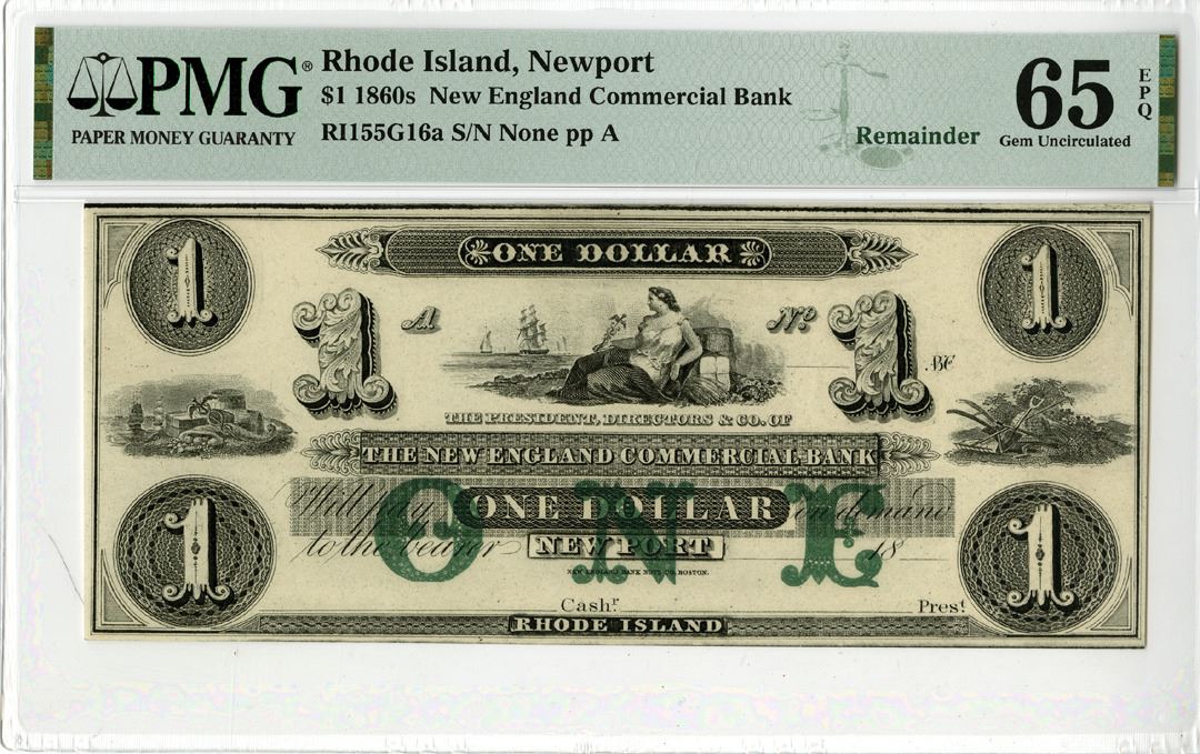 Rhode Island, 1860s. $1, R1155G16a, Remainder Banknote. Black with green overprint and reclining figure at top. PMG graded Gem Uncirculated 65 EPQ.