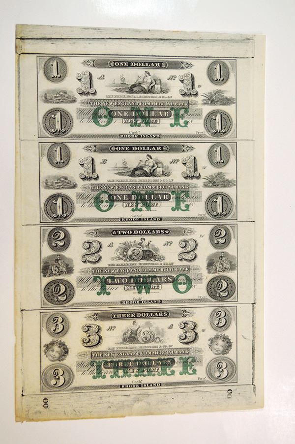 RI. $1-1-2-3. Female reclining on cotton bale on first two, Female reclining with large numeral on others. Green underprint. NEBNC. ABNC. Seems to have been four separate plates to make one print. Uncirculated.