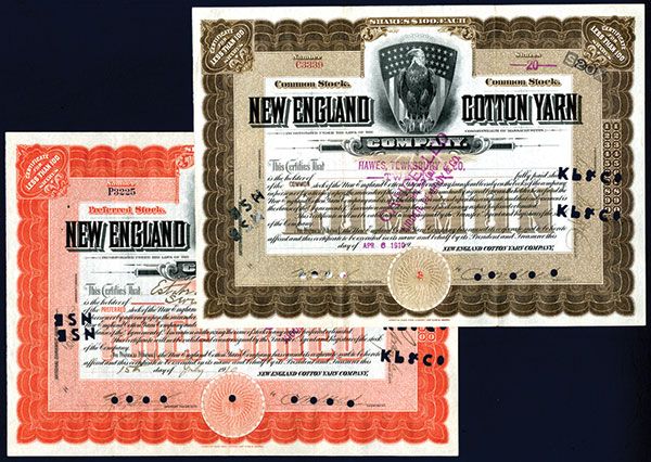 Massachusetts. 1910. 20 I/C Stock. #C3339 and P3225. Black print with brown border and underprint and Black print with orange border and underprint. Vignette top center of perched Bald Eagle with American Shield behind. Purple cancellation stamp and POC's, VF condition. ABNC.
