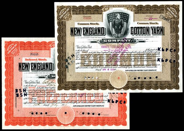 New England Cotton Yarn Co. 1910. I/C Stock, Lot of 2. Massachusetts. 1910. 20 I/C Stock. #C3339 and P3225. Black print with brown border and underprint and Black print with orange border and underprint. Vignette top center of perched Bald Eagle with American Shield behind. Purple cancellation stamp and POC's, VF condition. ABNC.