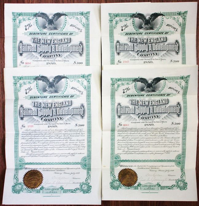 Maine. Lot of 4 pieces, all are: $500 I/U 7% Debenture Coupon Bonds, Black text with green border, Eagle with spread wings at top center. VF condition, HLBN. (4)