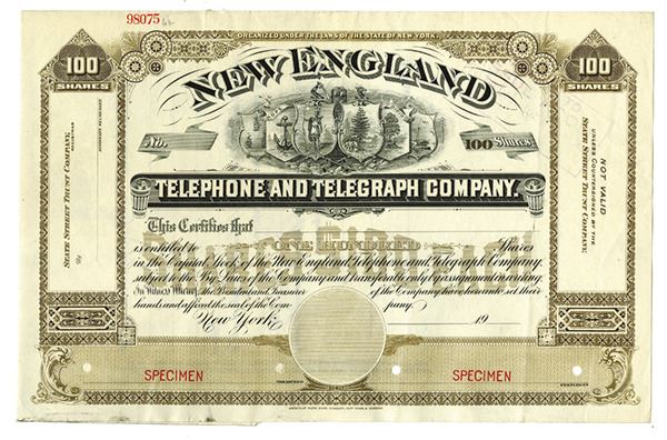 New York. 100 Shares, Capitol Stock Specimen Certificate. Black print with a light brown border and under tint. Vigentte at top of certificate of 6 different states arms. Specimen overprints, POC's, Fine condition with minor staining. ABNC.