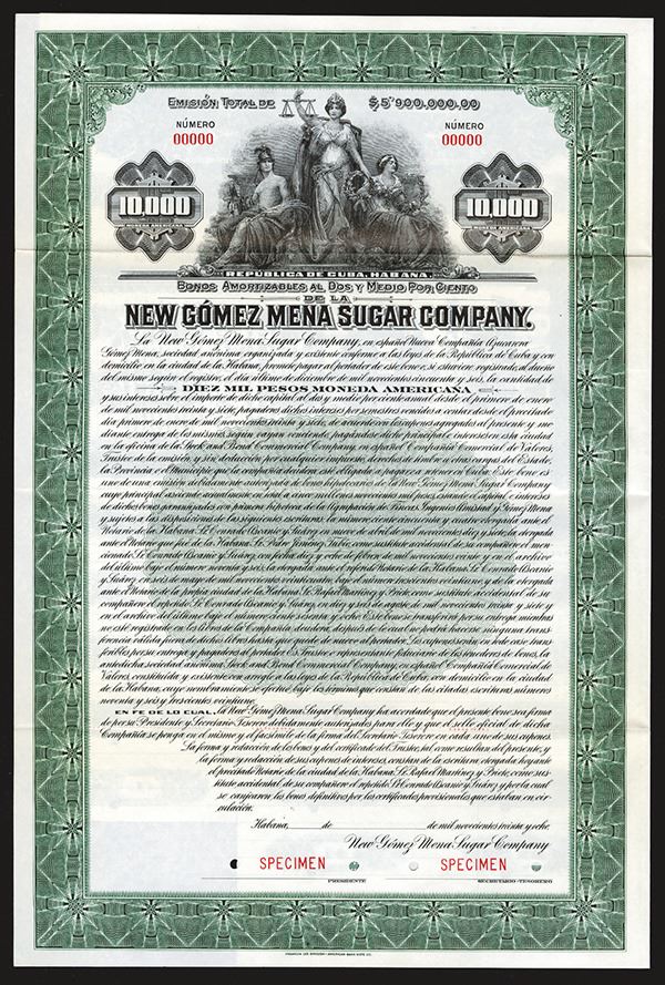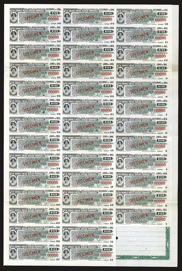 Cuba, 19xx, $10000, 2.5% Specimen Bond, Vertical format, Coupons attached, Black print on green border and underprint, Allegorical figures top center, Red SPECIMEN overprints and POC's and s/n "00000", VF-XF condition, FLABNC.