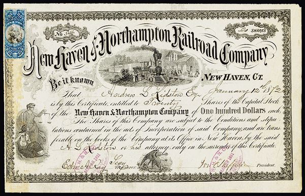 New Haven, Connecticut, 1872, 20 Shares, Issued and ink cancelled, Locomotive at station on top under ornate arched title, allegorical justice on lower left and eagle on bottom, Cert.#346, VF with light glue stains on the left margin, attractive and very scarce certificate.
