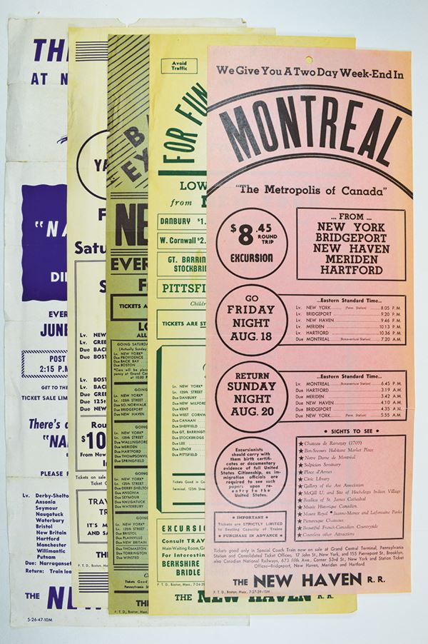 New Haven Rail Road. Advertising excursion pull sheets - Montreal, New England, The Berkshires, Yale-Harvard Game, Narragansett Park. 1939-1947. Longest is about 19 inches. Slight duplication, 6 pieces.