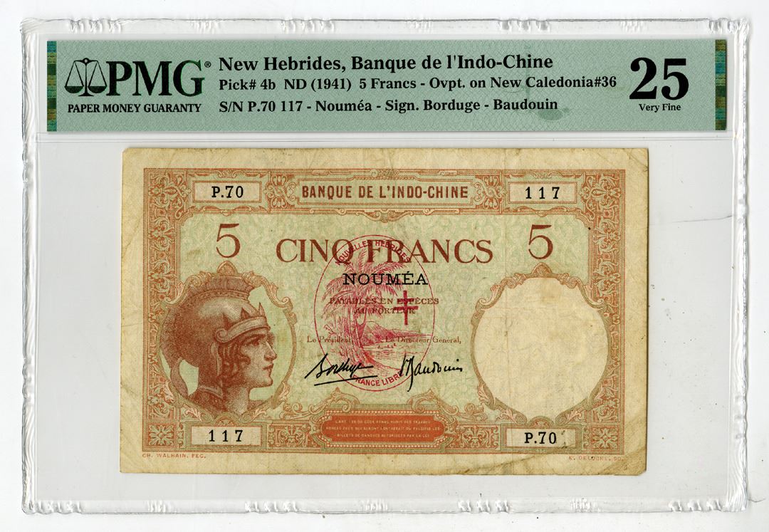 New Hebrides, ND (1941). 5 Francs, P-4b, Issued banknote, Overprint on New Caledonia P-36, Brown and green print with helmeted woman at left, S/N P.70 117, Noumea - Sign. Borduge - Baudouin, PMG graded Very Fine 25.