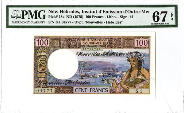 New Hebrides, 100 Francs, P-18c, Issued, Sign.#2, PMG graded Superb Gem Uncirculated 67 EPQ. Tied for finest known in PMG Census, none finer.