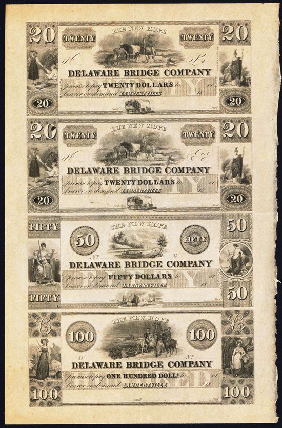 Lambertville, New Jersey, 18xx (ca.1830-47), Uncut sheet of 4 obsolete banknotes, $20-$20-$50-$100, NJ-280-X2 (G24, 24, 26, 28), Unissued sheet, the $20 note has young man giving flower to young woman on left, cattle and sheep in middle and standing Liberty and shield on right with small train on bottom; the $50 note has barge being pulled along canal in middle with seated liberty on left and standing allegorical woman on right with cornucopia; $100 has woman with rake on left, milkmaid on right with Washington after crossing the Delaware in the Battle of Trenton, 1776 in middle, the sheet has been folded vertically in the middle and has folds in the middle horizontally, the paper is fresh and crisp and these folds keep this attractive sheet from AU to Uncirculated condition. New England Bank Note Company.