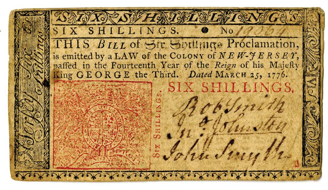 New Jersey. March 25th, 1776. 6 Shillings, S1821, Issued Colonial Note, Red and black, S/N 19064, Signed by Smith, Johnston and Smyth. Printer: Isaac Collins. Mica flaked paper.