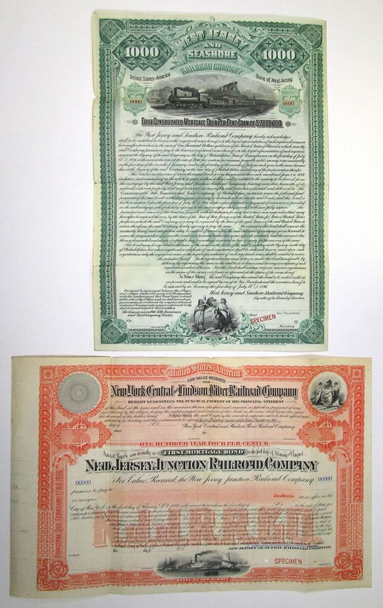 New Jersey, 1896 Specimen Railroad Bond Pair, Includes: NJ, 1896, New Jersey Junction Railroad Co. $-Odd , 4% Registered First Mortgage Bond, Black printing with orange border, Seal of NJ at top left and view of river at bottom, ABNC; NJ, 1896, West Jersey and Seashore Railroad Co. $1000, 4% First Consolidated Mortgage Coupon Bond, Black print with green border, Train passing station at top under company title and seal of NJ at bottom, ABNC. Both have Specimen overprints and POCs, and range from Fine to VF+ condition. Attractive railroad bond pair.