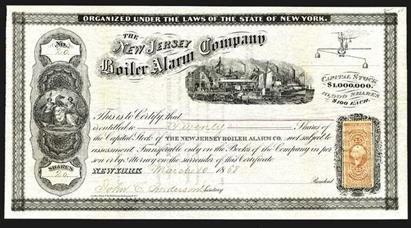 NJ. March 1868, 20 Shares. Partially Issued, Uncancelled, image of the alarm on top right, middle with dock and harbor scene, NJ arms at left, S/N 20, XF, attractive and rare. Not signed by president but uncancelled revenue stamp at the top right.