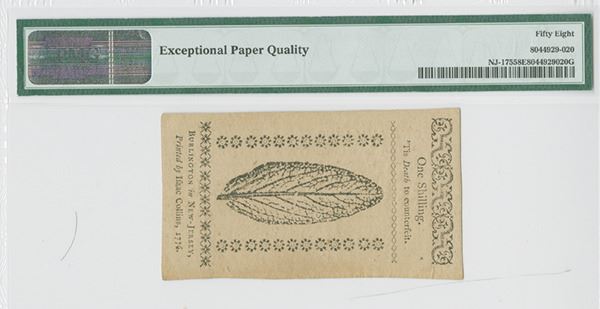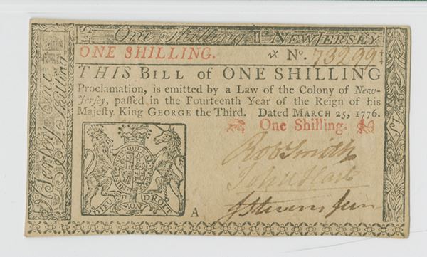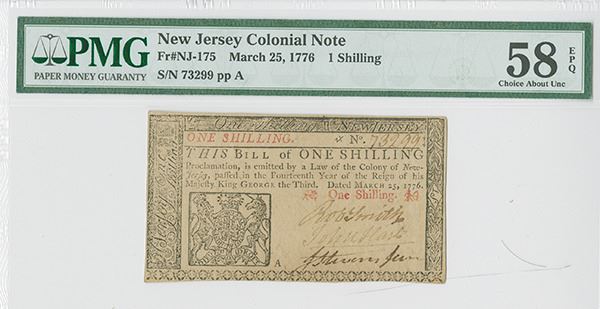 New Jersey, Arms on face at left, red overprint "One Shilling", Signed by Rob Smith, John Hart and J.Stevenson? S/N 73299 pp A, PMG graded Choice About Uncirculated 58 EPQ. John Hart was a public official and politician in colonial New Jersey who served as a delegate to the Continental Congress and also signed the Declaration of Independence.