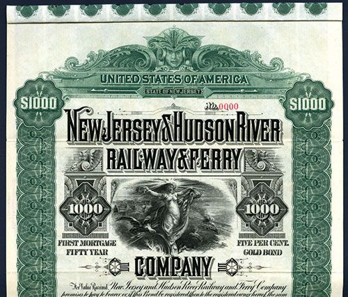 New Jersey, 1900. $1000, Specimen bond, 1st Mortgage 5% Gold Bond, Black with green border and underprint, Dramatic vignette of allegorical liberty with flag and eagle, S/N “0000 “ and POC's, coupons attached, XF condition, WBNC. Rare bond and possibly unique.
