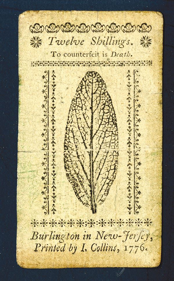 NJ, 12 Shillings, P-S1822, Black and red, back black leaf, Mica flaked paper, Fine condition, S/N 3656, I.Collins, printer.