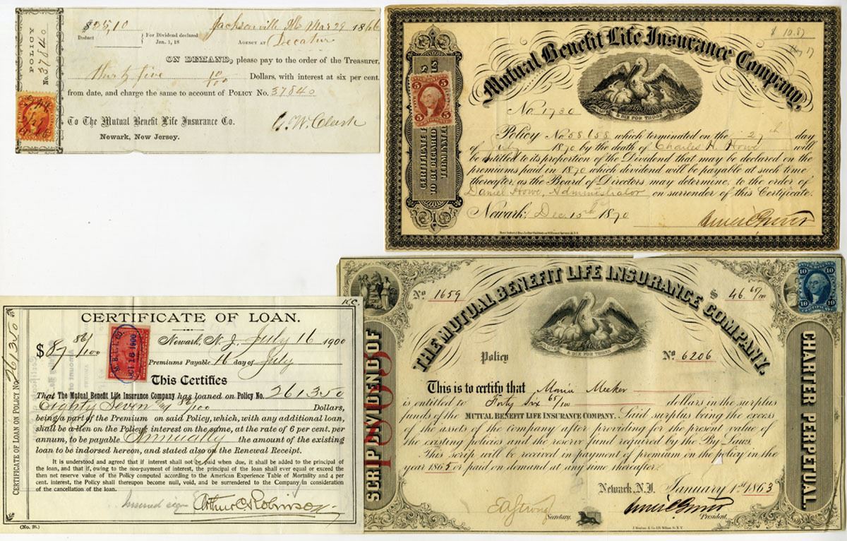 New Jersey, 1963-98. Lot of 4 Documents from the Mutual Benefit Life Insurance Co., including policies and loans, Documents are Revenue stamps and range from VF to XF condition. (4).