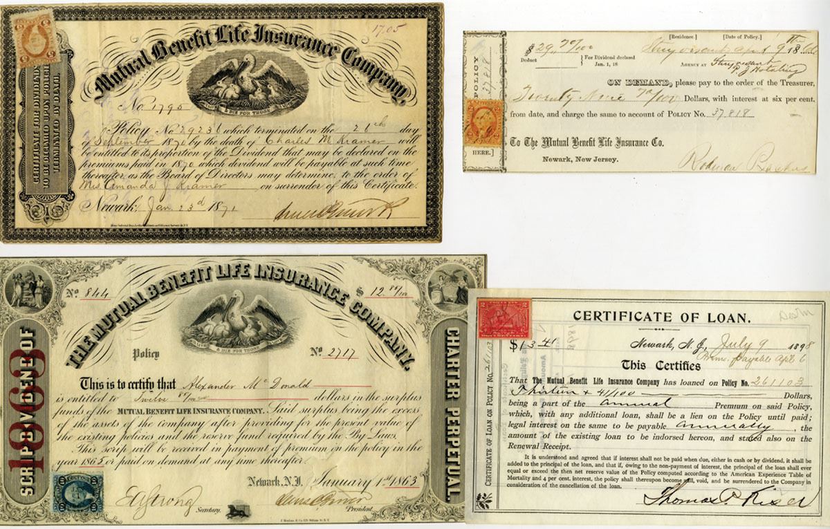 New Jersey, 1963-98. Lot of 4 Documents from the Mutual Benefit Life Insurance Co., including policies and loans, Documents are Revenue stamps and range from VF to XF condition. (4).