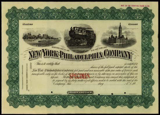 19--(ca. 1900-1920). Specimen. Odd shs, Capital Stock, Green border. Vignette of speeding locomotive in middle, NY harbor on left and Philadelphia City Hall on right. XF with light toning. SBNC. Rare stock certificate.