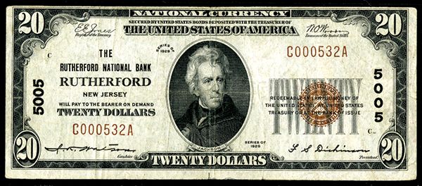 New Jersey. Rutherford. Charter 5005. Rutherford National Bank. $20 1929 Type I. Fr. 1802-1. S/N C000532A. PMG 25 Very Fine. 5 small size $20s known on this bank.