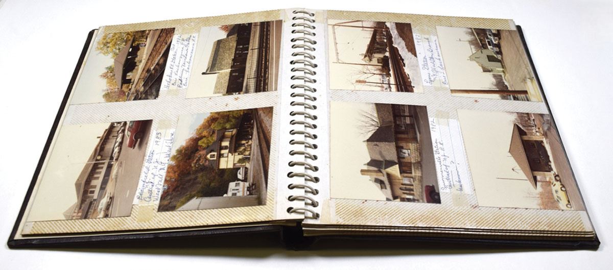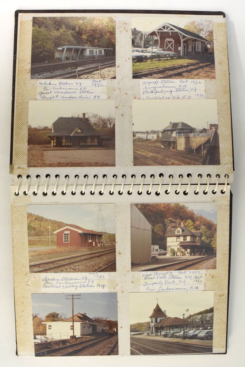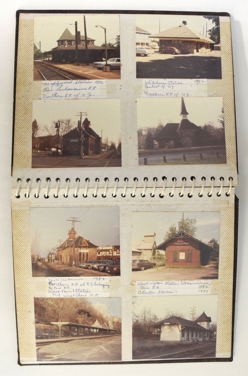 New Jersey & New York. Album of 63 Photographs of Train Stations from around New Jersey and New York, Includes: Park Ridge Station, NY, 1982; River Edge Station, NJ, 1982; Pearl River Station, NJ, 1982; Hohokus Station, NJ, 1982; Great Meadows Station, NJ, 1982; Wycoff Station, NJ, 1982; Arlen Station, NJ, 1982; Central Valley Station, NY, 1982; West Valley Station, NY, 1982; Westfall Station, NY, 1983; Lyons Station, NJ, 1983; Sommerville Station, NJ, 1983; Rivervale Station, NJ, 1982; Hillsdale Station, NJ, 1982; Maplewood Station, NJ, 1982; Whitehouse Station, NJ, 1982; West Point Station NJ, 1982; Closter Station, NJ, 1982; Ridge Wood Station, NJ, 1982; and more. Album is an old-style photo album with sticky-backed pages and clear lift-up plastic covers for securing photographs that is in VF to XF condition. Sold "AS IS" no returns accepted. (Garden State Railroad Collection).