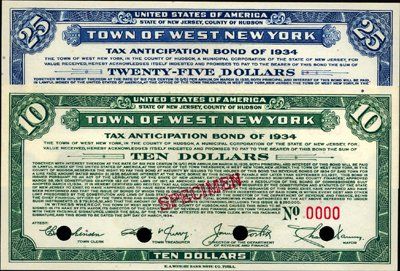 1934. $10; $25. "Tax Anticipation Bond of 1934". 2 different specimen Banknotes, the $10 in green and the $25 in blue. Red specimen overprints, POC's and "00000" serial numbers.No vignette. Gem Uncirculated. Scarce pair. E.A. Wright BNC