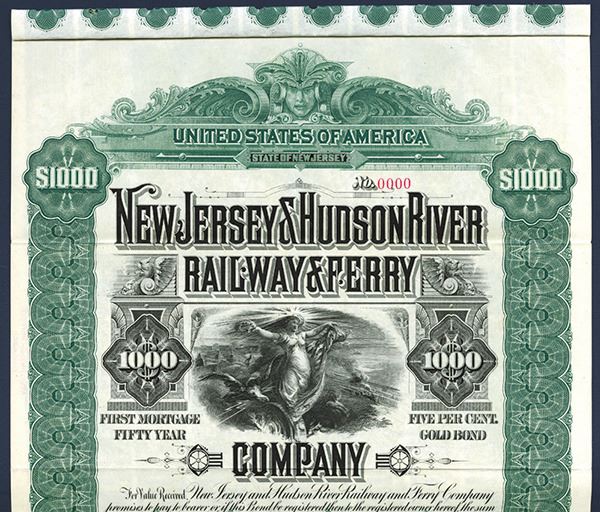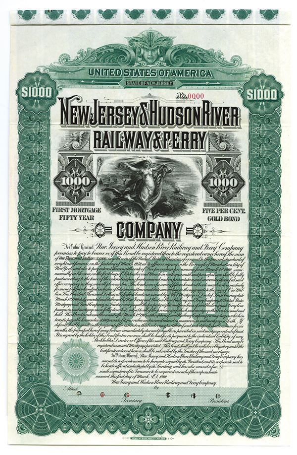 New Jersey. $1000 Specimen 5% 1st Mortgage Gold Coupon Bond. Black print with a very ornate green border and underprint. Dramatic vignette of allegorical liberty holding a flag and standing beside an American Bald Eagle with lightening bolts in his talons. S/N "0000" and POC's, coupons attached, XF condition, WBNC. Rare bond and possibly unique.