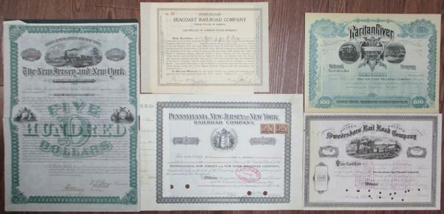 Various States. Lot of 5 stocks and bonds, Includes: New Jersey and New York Railroad Co. 1880 $500 I/U 6% First Mortgage Bond #102 in green; Seacoast Railroad Co. 1898 22 22/100 Shares I/C Stock Certificate #20 on off-white paper; Raritan River Railroad Co. ND (1880s) 100 Shares U/U Capital Stock Certificate in green; Swedesboro Rail Road Co. 1874 48 Shares I/C Capital Stock Certificate #173 in black and white; and Pennsylvania, New Jersey and New York Railroad Co. 1902 10 Shares I/C Capital Stock Certificate #6 in black and white. 5 pieces.