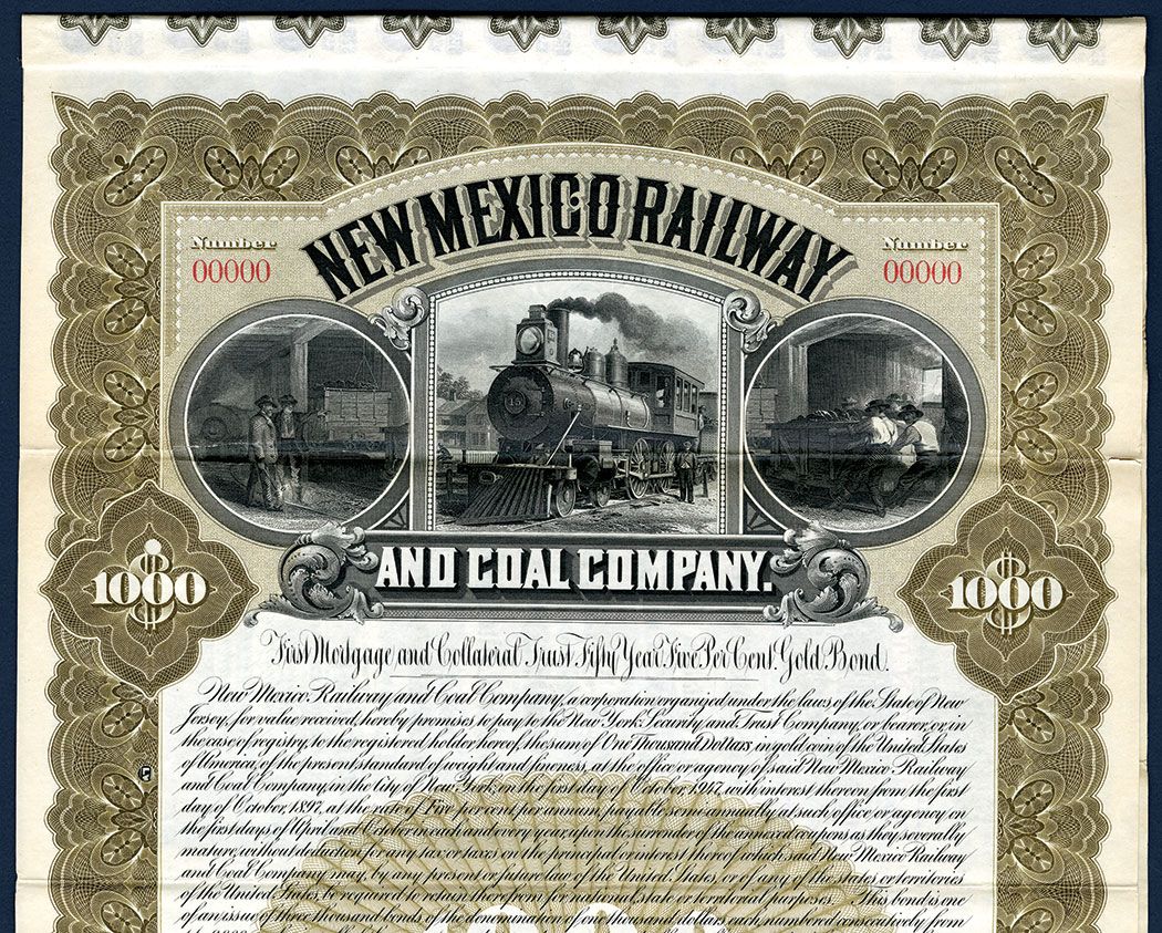New Jersey, 1897, $1000, 1st Mortgage and Collateral Trust 50 Year 5% Gold Specimen Bond, Vertical format, Coupons attached, Coal mining vignettes flanking moving locomotive top center, POC's, VF condition with minor tears at creases and slight toning, ABNC. Listed railway unlisted bond in Cox.