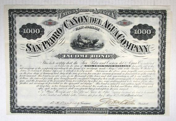 New Mexico, 1880. I/U bond. $1000. 1st Mortgage 7% Income Bond. Black border. XF condition. Rancher with cattle under ornate title. Coupons attached. This company was the subject of a long-term lawsuit with the U.S. government that was begun in 1881(right after this bond issue and the company was started) and completed in 1897 when the U.S. courts found that the property claimed by this company in New Mexico was obtained by a fraudulent survey. The company tried to control all of the copper and gold mining in the area but the survey was inaccurate and included a large and valuable mining area that should have been in the public domain. Rare and Interesting mining Company. FBNC.
